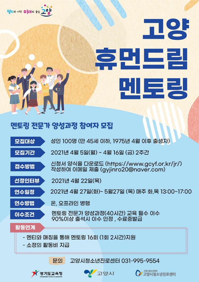 모집 대상은 만 45세 이하의 고양시민 성인 100명이다. 연수는 오는 27일부터 5월 27일까지 매주 화요일, 목요일에 온·오프라인을 병행해 진행된다. 이수한 후, 참여자는 관내 초·중·고등학생들을 대상으로 1:1 맞춤형 멘토링을 진행할 예정이다.