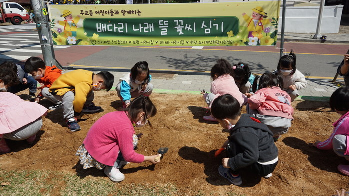행사에 참여한 주교동 ‘해나라 어린이집’과 ‘보람 어린이집’ 아이들은 직접 흙을 만지고 꽃씨를 뿌리는 체험을 하며, 씨앗이 아름다운 꽃으로 변화할 모습을 기대했다.