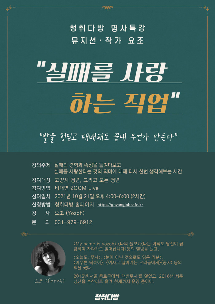 [부자동네타임즈 김인수기자] 고양시가 청취다방(청년들의 취업과 소통이 있는 수다방)에서 10월 21일(목)에 뮤지션이자 작가로 활동 중인 요조를 초청하여 명사특강을 진행한다.