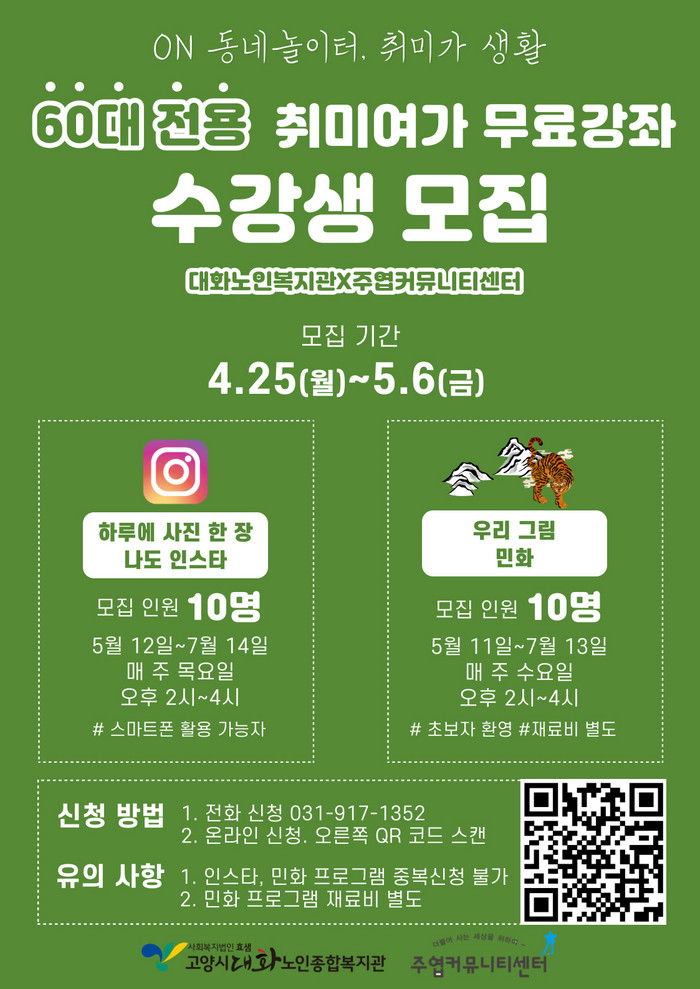 ‘어르신 즐김터’ 1기 참여자 모집은 4월 25일(월)부터 5월 6일(금)까지 진행된다. 신청은 고양시대화노인종합복지관으로 전화 또는 방문 신청하면 된다.