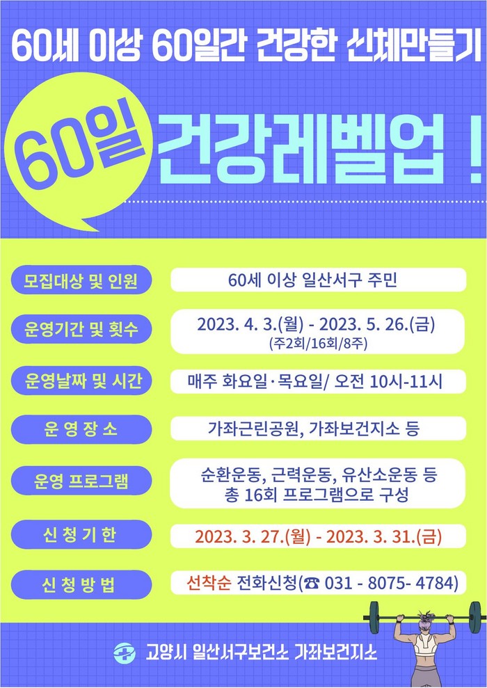 [부자동네타임즈 김인수기자] 일산서구보건소가 60세 이상 일산서구 주민을 대상으로 4월부터 60일 건강레벨업을 운영한다. 보건소는 3월 27일부터 3월 31일까지 참여자를 선착순 모집한다고 밝혔다.