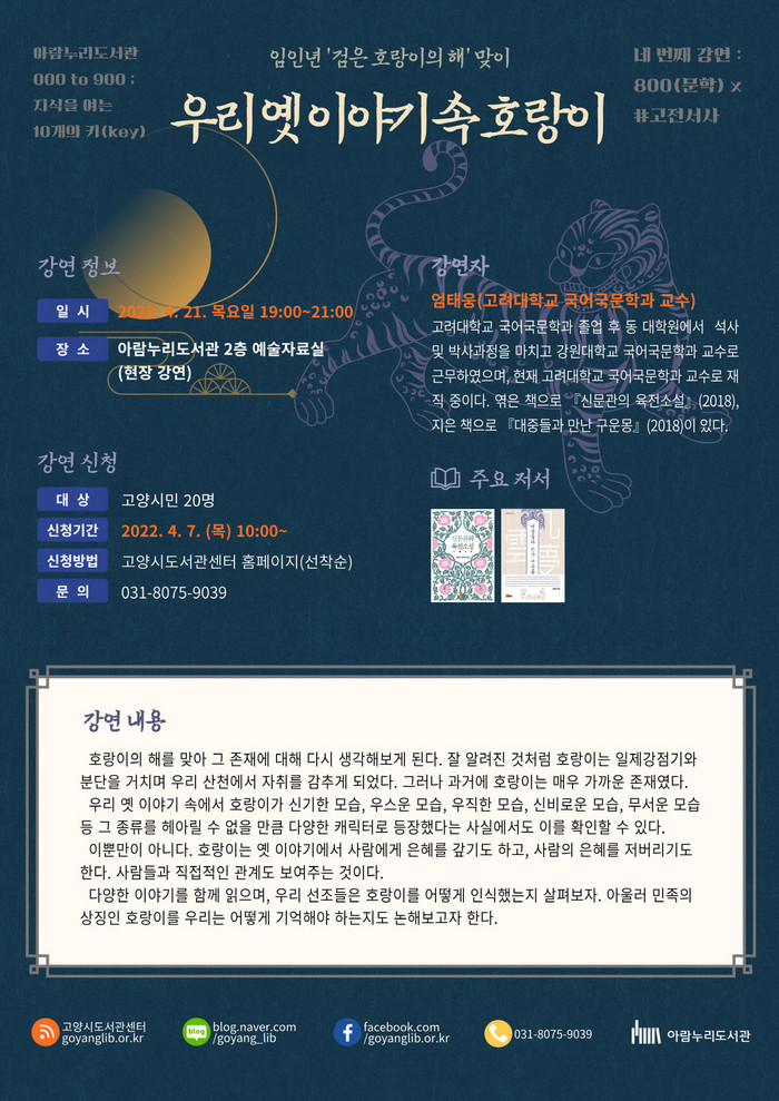 [부자동네타임즈 김인수기자] 고양시 아람누리도서관은 오는 4월 21일 목요일 오후 7시, 검은 호랑이의 해를 맞이하여 독서문화프로그램 ‘우리 옛 이야기 속 호랑이’ 를 운영한다.