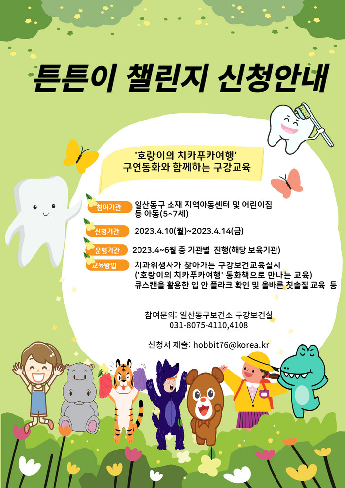 [부자동네타임즈 김인수기자] 일산동구보건소는 4월 10일부터 4월 14일까지 일산동구 소재 지역아동센터 및 어린이집을 대상으로 어린이 구강보건교육 ‘튼튼이 챌린지’ 참여 기관을 모집한다.