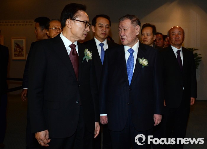 | △ 이명박(왼쪽) 전 대통령과 정몽구 현대자동차그룹 회장이 24일 오후 서울 용산구 그랜드 하얏트 서울 호텔에서 열린 정주영 현대그룹 명예회장의 탄생 100주년 기념식에 참석해 사진전을 둘러보고 있다. <사진제공=포커스뉴스> |