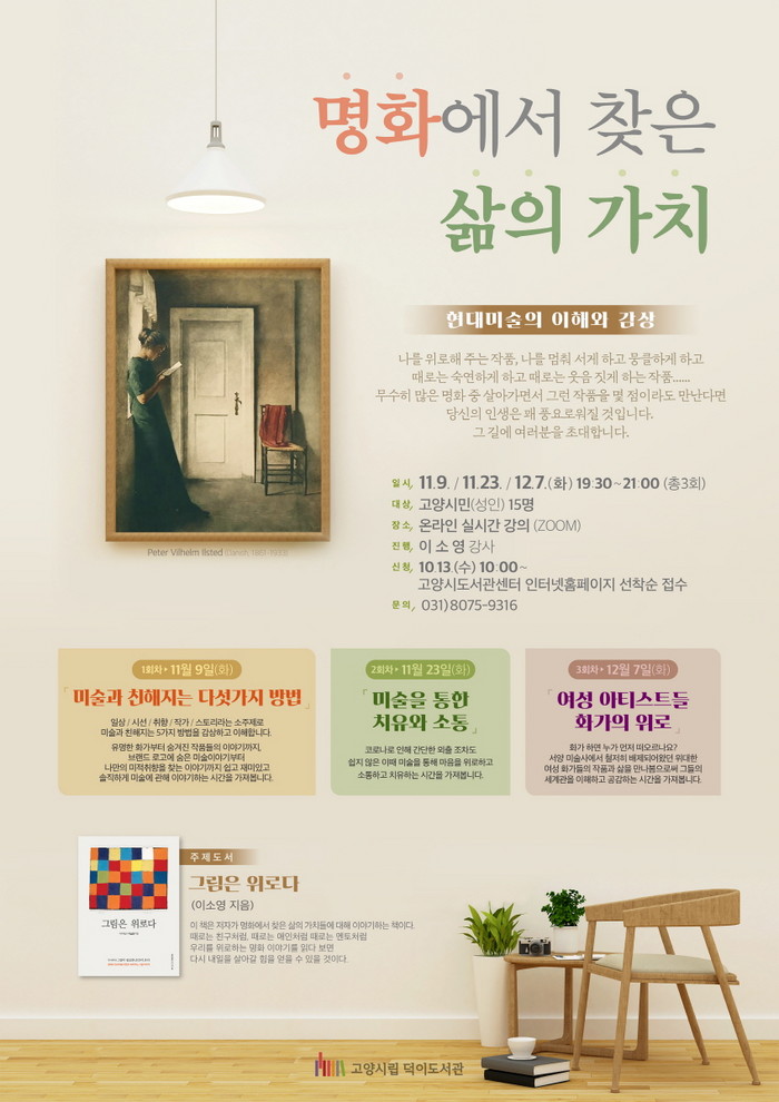 프로그램은 11월부터 총 3회에 걸쳐 온라인(Zoom)으로 진행되며, 강의는 고양시민(성인)을 대상으로 운영된다. 아트메신저 이소영 전문 강사가 그 진행을 맡는다.