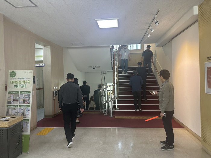 [사진설명] 고양시청 직원들이 안내에 따라 지하 대피소로 이동하고 있다.