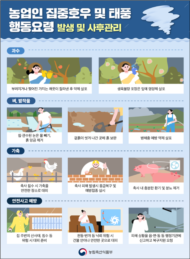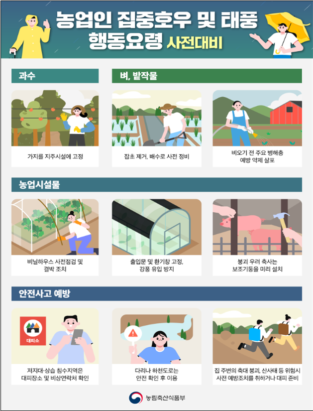 송미령 농식품부 장관은 “그동안 많은 강수로 피해가 누적된 상황에서 이번 주말까지 전국적으로 최대 100㎜ 이상의 많은 비가 추가 예보된 만큼 농가와 유관기관 등은 배수로 일제 정비, 취약시설 점검, 병해충 예방을 위한 약제 살포 등 2차 피해방지를 위해 노력해 줄 것”을 당부하였다.