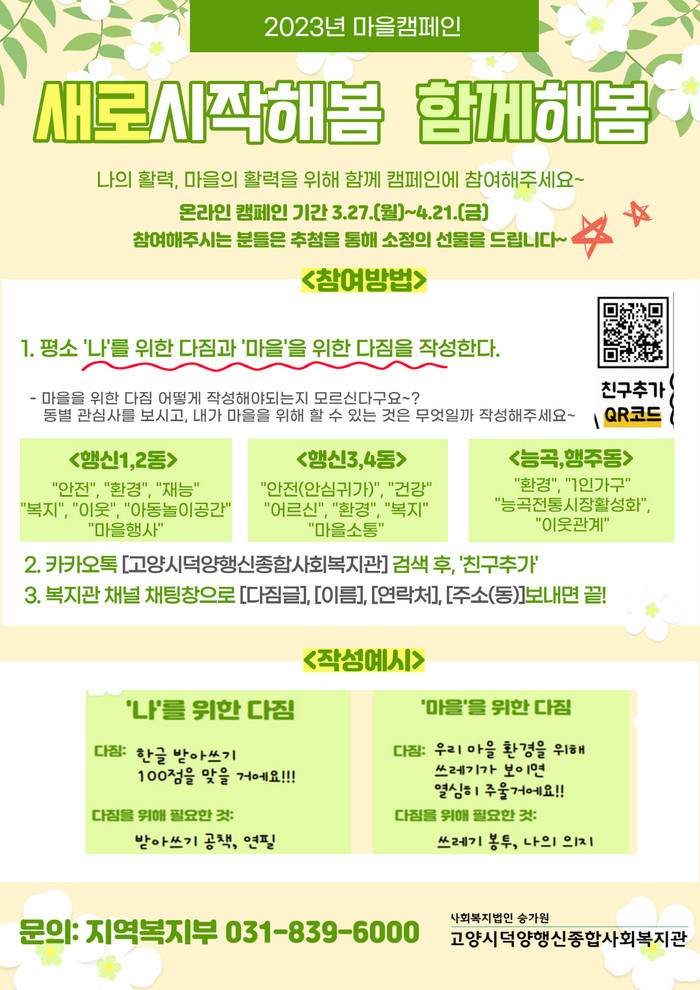 [부자동네타임즈 김인수기자] 고양시 덕양행신종합사회복지관이 3월 27일부터 4월 21일까지 마을 캠페인 ‘새로 시작해 봄, 다시 해 봄’을 진행한다.