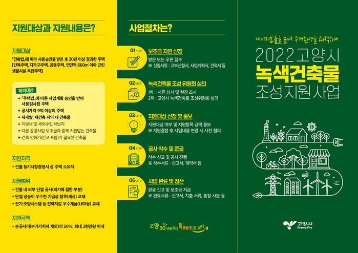 [부자동네타임즈 김인수기자] 고양시는 주택의 에너지효율 향상과 시민의 주거환경 개선을 위한 ‘2022년 녹색건축물 조성 지원 사업’을 전년의 16배 이상 규모로 확대 시행한다고 18일 밝혔다.