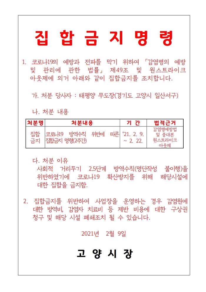 [부자동네타임즈 김인수기자] 고양시는 "지난 3일부터 코로나19 확진자가 다수 발생한 일산서구 주엽동 소재 태평양무도장과 동경식당에 대해 방역수칙 위반에 따른 행정처분을 했다."고 9일 밝혔다.