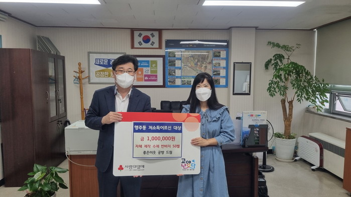 [부자동네타임즈 김인수기자] 고양시 행주동(동장 김종성)은 "지난 8일,‘좋은 이웃공방’이 후원금 100만 원과 자체 제작한 수제 반바지 50벌을 기탁했다."고 밝혔다.