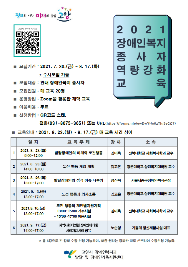 [부자동네타임즈 김인수기자] 고양시가 관내 장애인복지 종사자의 전문성 함양을 위한 ‘2021년 장애인복지 종사자 역량강화교육’을 지난 23일부터 오는 9월 17일까지 비대면으로 총 6회 진행한다.