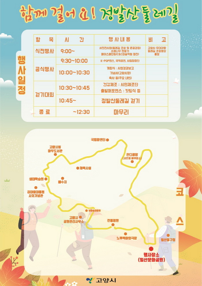 [부자동네타임즈 김인수기자] 고양시가 정발산공원 둘레길 조성을 기념해 11월 27일(토) 일산문화공원 및 정발산공원 일원에서 걷기행사를 겸한 개장식을 개최한다.