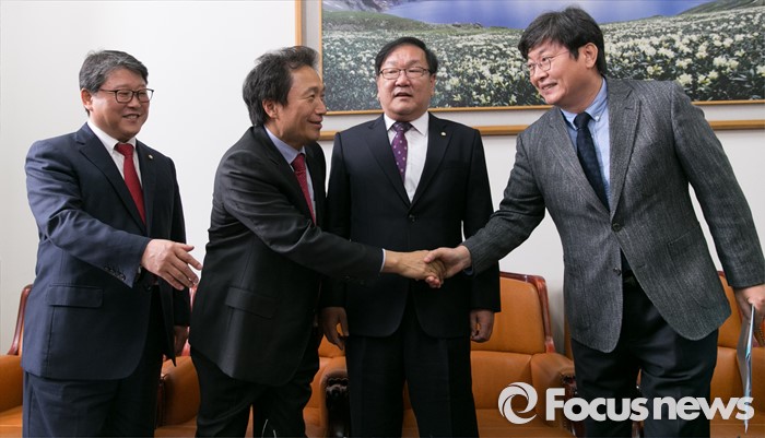 | △ 10일 오후 서울 여의도 국회에서 진행된 국회의원 선거구 획정 등 논의를 위한 회동에 앞서 조원진(왼쪽부터) 새누리당 원내수석부대표, 정치개혁특별위원회 이학재 여당 간사, 김태년 야당 간사, 이춘석 새정치민주연합 원내수석부대표가 인사하고 있다. <사진제공=포커스뉴스> |