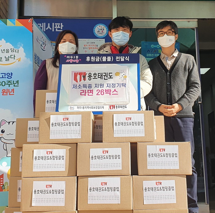 [부자동네타임즈 김인수기자] 고양시 마두1동에 소재한 KTI용호태권도장(관장 권동균)은 지난 1월 20일 마두1동 행정복지센터를 방문해 겨울철 관내 어려운 이웃을 위해 사용해 달라며 사랑의 라면트리(라면 20개입 26박스)를 전달했다.