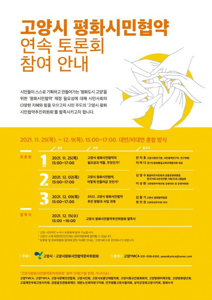[부자동네타임즈 김인수기자] 고양시가 ‘고양 평화시민협약’ 제정을 본격 추진하기에 앞서 평화시민협약 제정 필요성에 대한 공론을 형성하기 위해 연속 토론회를 개최한다.