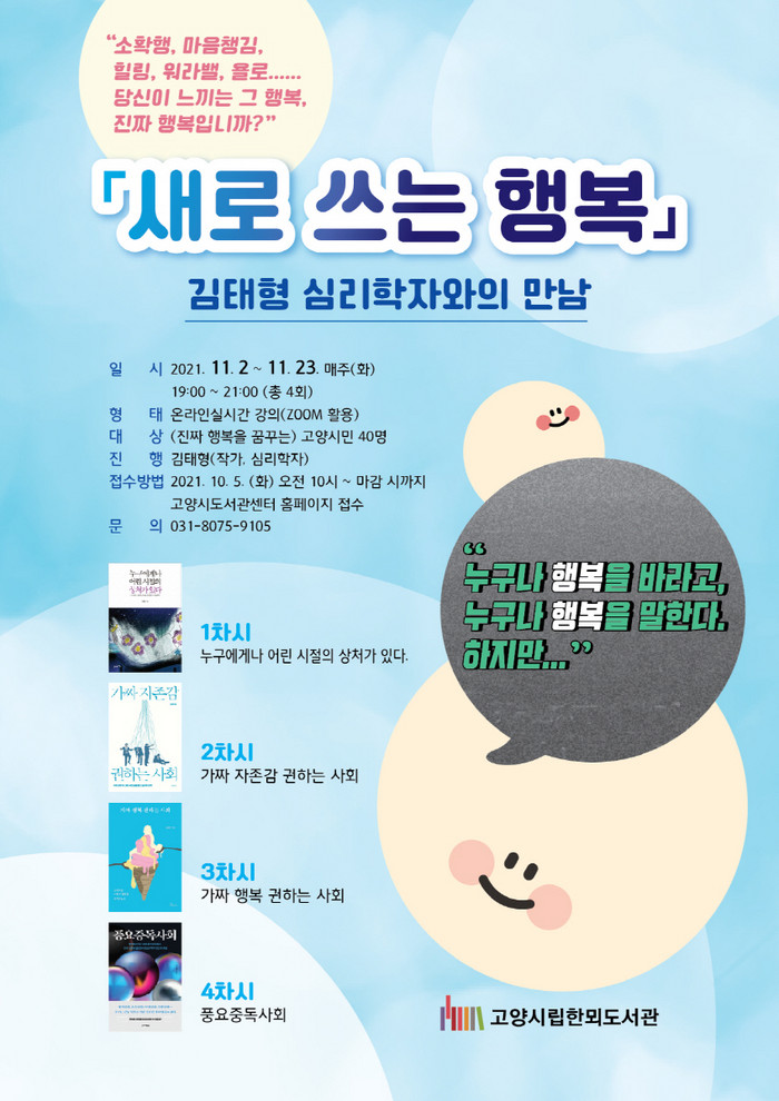 [부자동네타임즈 김인수기자] 고양시 한뫼도서관이 11월 2일(화)부터 23일(화)까지 매주 화요일 오후 7시부터 김태형 심리학자와의 만남 새로 쓰는 행복 프로그램을 온라인으로 운영한다.