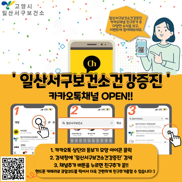 참여 희망자는 카카오톡 상단의 돋보기 모양 아이콘 클릭 후 검색창에 “일산서구보건소건강증진”을 검색해 채널추가 버튼을 누르거나, QR코드를 스마트폰으로 촬영해 가입하면 누구나 쉽게 이용할 수 있다. 문의 전화는 일산서구보건소로 하면 된다.