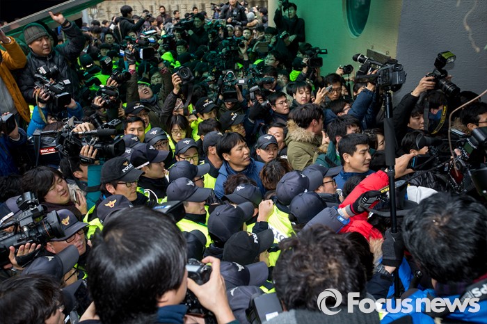 | △ 경찰이 예고한 한상균 민주노총 위원장에 대한 체포영장 집행 최후 통첩 시각이 다가오고있는 9일 오후 한 위원장이 은신중인 조계사 부속 건물 입구에서 경찰병력이 진입을 시도하자 조계사 관계자들이 저지하며 몸싸움이 벌어지고 있다. <사진제공=포커스뉴스> |