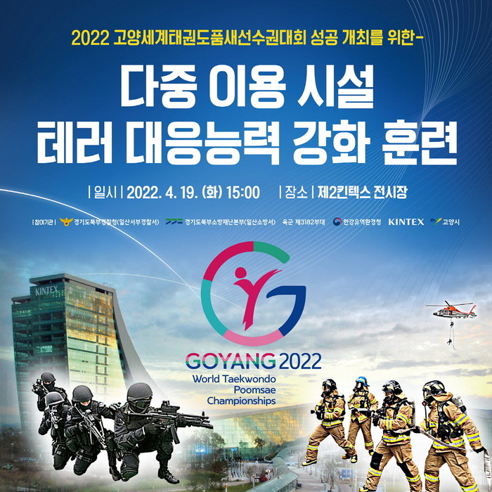 시는 4월 21일부터 24일까지 열리는 ‘고양 세계태권도품새선수권대회’ 개최를 앞두고 있다. 전세계 70여개국 2,000여명의 선수와 관람객의 안전을 위해 시는 코로나19 유행 이후 처음으로 현장대응 훈련을 실시해 기관간 유기적인 협조 체계를 구축하고 현장대응 역량을 강화할 방침이다.