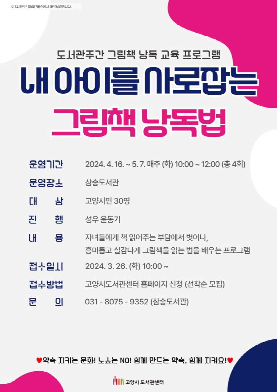 [부자동네타임즈 = 김인수 기자] 고양특례시 삼송도서관은 제60회 도서관주간을 맞이해 성우와 함께하는 그림책 낭독 프로그램 ‘내 아이를 사로잡는 그림책 낭독법’을 4월 16일부터 운영한다고 밝혔다.
