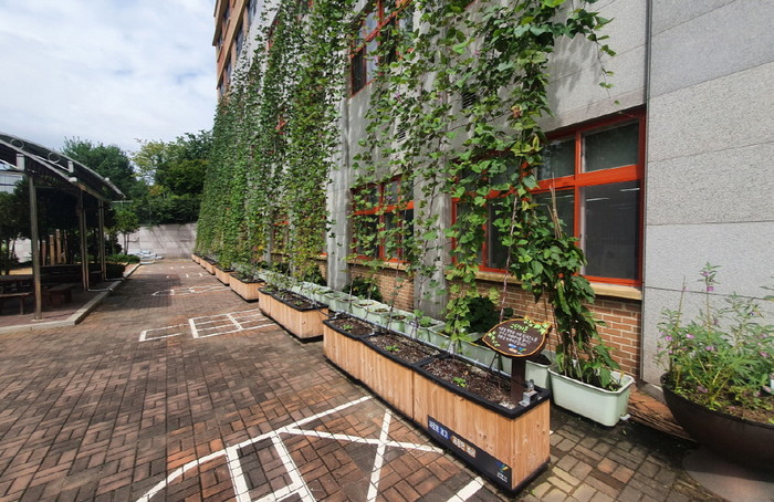 그린커튼 조성에 선정된 넝쿨식물은 제비콩(흑편두)으로 성장 높이가 15미터에 달한다. 가을에는 자주색의 열매를 맺기 때문에 수확의 즐거움도 느낄 수 있다.