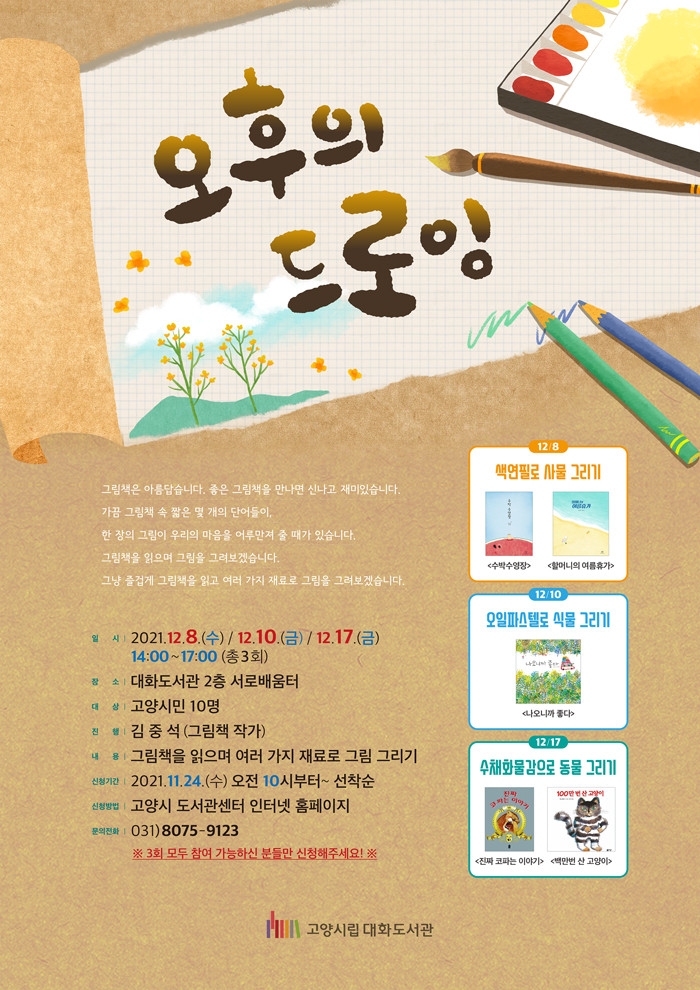 [부자동네타임즈 김인수기자] 고양시 대화도서관이 독서문화프로그램 오후의 드로잉을 12월 8일, 10일, 17일 오프라인으로 운영한다.
