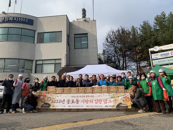 행사 전날 송포동 직능단체 회원들은 김장에 필요한 식자재인 절임배추, 무, 고춧가루 등을 구매하여 김장 준비를 마쳤다. 행사 당일 추워진 날씨 속에서도 김치 속을 버무리고 완성된 김장 김치를 정성스럽게 전달 박스에 담는 등 구슬땀을 흘렸다.