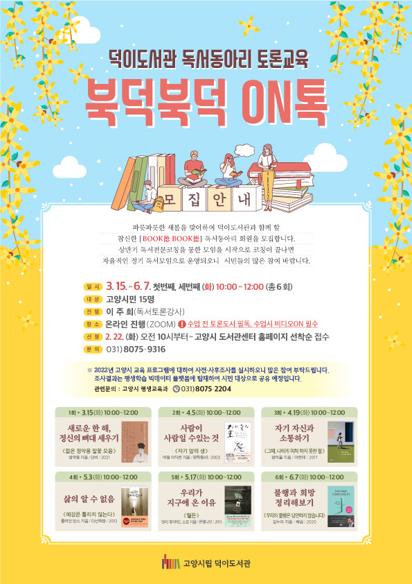 [부자동네타임즈 김인수기자] 고양시 덕이도서관이 새봄을 맞이하여 독서전문코칭 수업을 통한 독서 토론교육'북덕북덕 ON톡' 강좌를 진행한다.