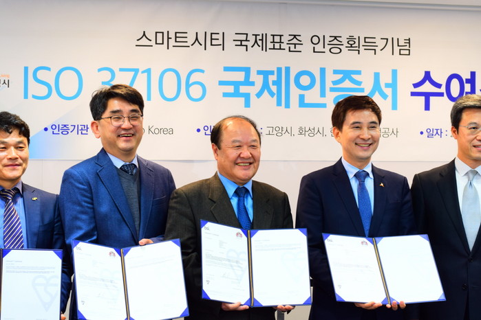 고양시는 지난해 12월 스마트시티 국제인증(ISO 37106)을 획득하고 이날 국제인증 수여식에 배상호 도시균형개발국장과 안동수 스마트도시팀장 등이 참석해 인증서를 받았다.