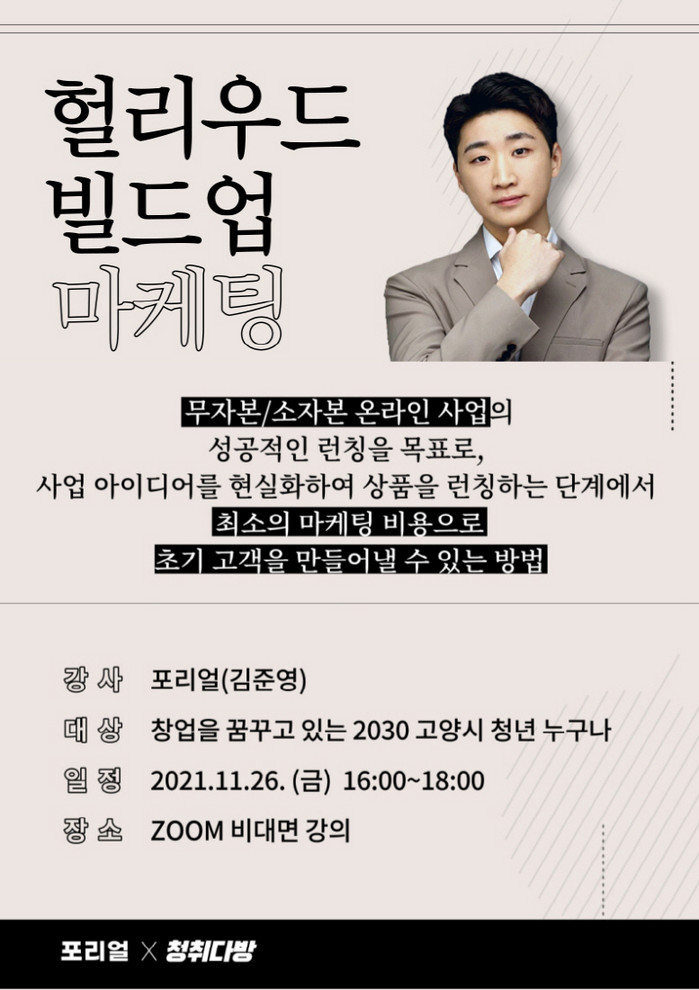이번 강연은 초기 자본이 적은 청년 창업을 위한 특강으로 온라인 실시간(Zoom) 회의를 통해 진행된다. 창업에 관심이 있는 고양시 청년이라면 누구나 참여할 수 있다.