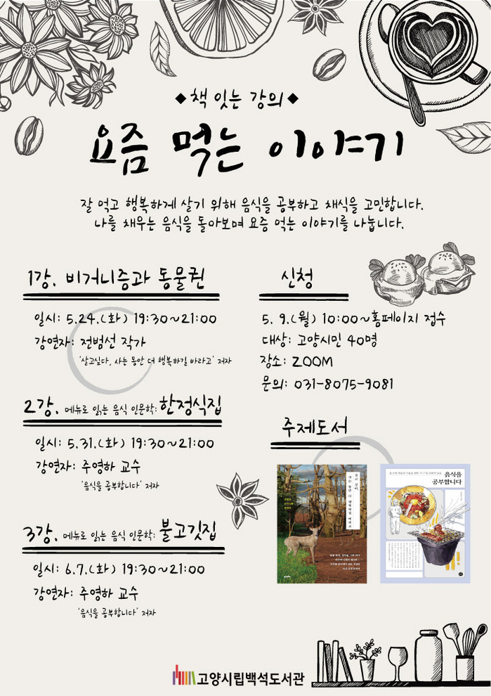 [부자동네타임즈 김인수기자] 고양시 백석도서관은 오는 5월 24일부터 6월 7일까지 총 3회에 걸쳐 고양시민을 대상으로 책 잇는 강의: 요즘 먹는 이야기을 진행한다.