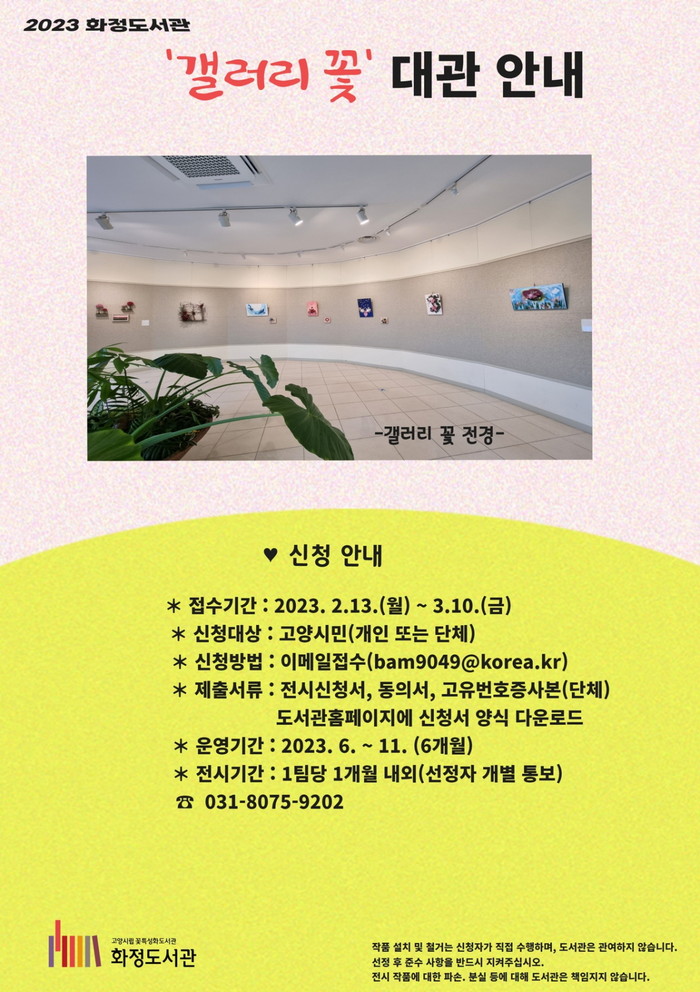 선정 결과는 유선으로 통보할 예정이며 작품 설치 및 철거는 신청자가 직접 수행해야 한다. 기타 대관 관련 문의는 화정도서관(☎ 031-8075-9202)으로 하면 된다.
