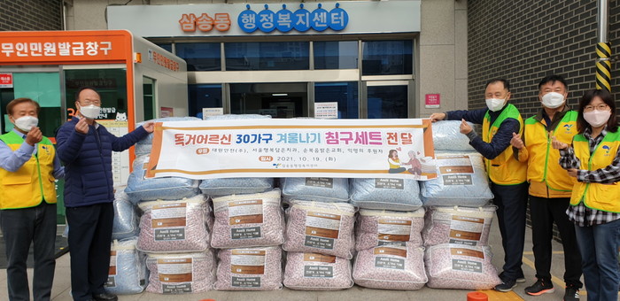 삼송동 지역사회보장협의체는 삼송동 소재 대원안전(주), 서울행복담은치과, 순복음밝은교회 외 익명의 정기 후원자의 기부금 450만원으로 삼송동 관내 업체에서 1가구당 15만원 상당, 총 30세트의 침구세트를 구입해 전달했다.