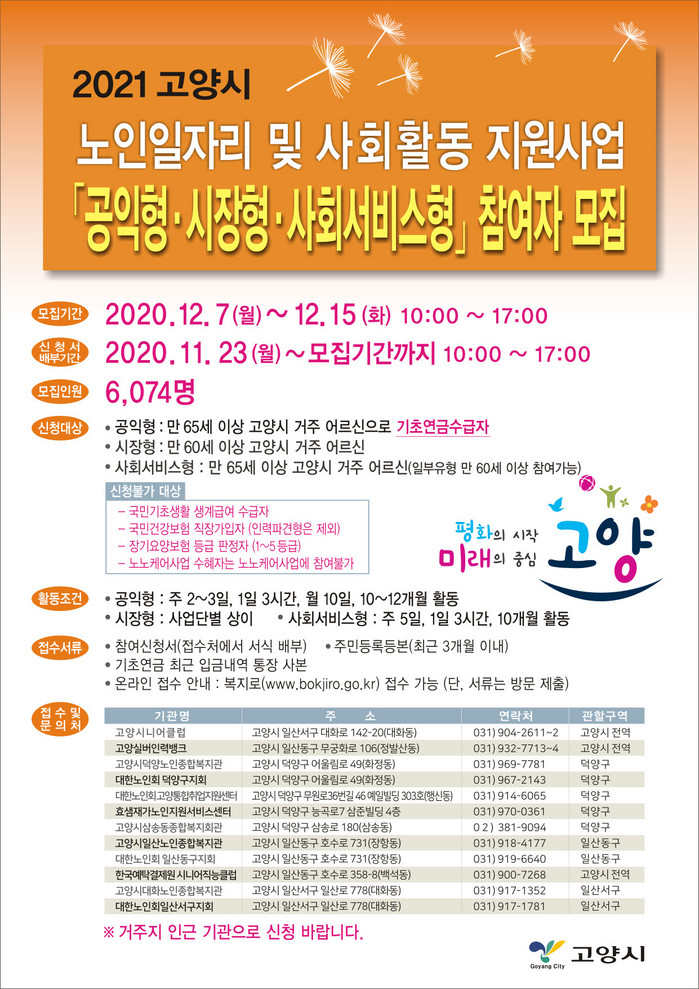 2021년 고양시 노인일자리 및 사회활동 지원사업은 만65세 이상 기초 연금 수급 노인이 참여 가능한 공익활동형, 만60세 이상 기초연금 미수급 노인도 참여 가능한 시장형, 공익활동형과 참여대상이 같지만 근무시간이 월 60시간 이상으로 비교적 급여가 많은 사회서비스형으로 나눠 추진된다.