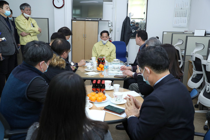이어 이날 오전 11시에 이 시장은 기자실을 찾아 티타임을 가졌다. 코로나-19와 관련해 기자들과 다양한 질의 답변이 이어졌다.