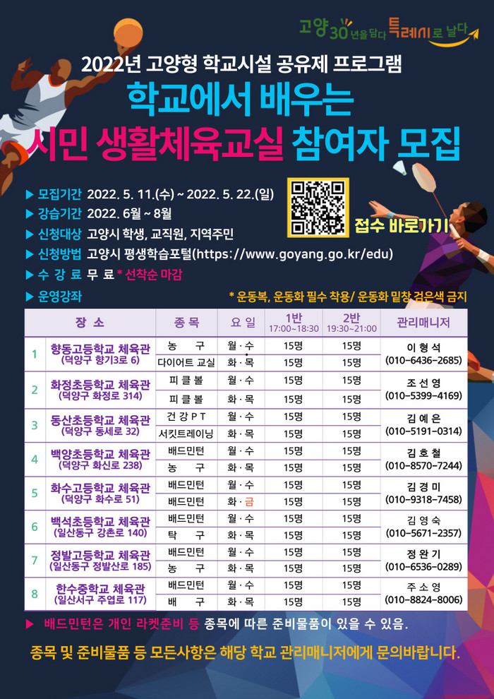 [부자동네타임즈 김인수기자] 고양시가 학교에서 배우는 시민 생활체육교실 참여자를 모집한다. 시는 학생, 교직원, 지역주민을 대상으로 5월 11일부터 5월 22일까지 선착순으로 모집한다고 밝혔다.