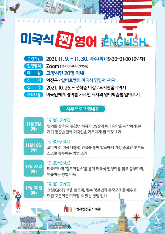 [부자동네타임즈 김인수기자] 고양시 신원도서관이 취업준비생과 직장인의 영어 학습 수요를 반영해 11월 9일부터 30일까지 매주 화요일 ‘미국식 찐영어’를 비대면으로 운영한다.