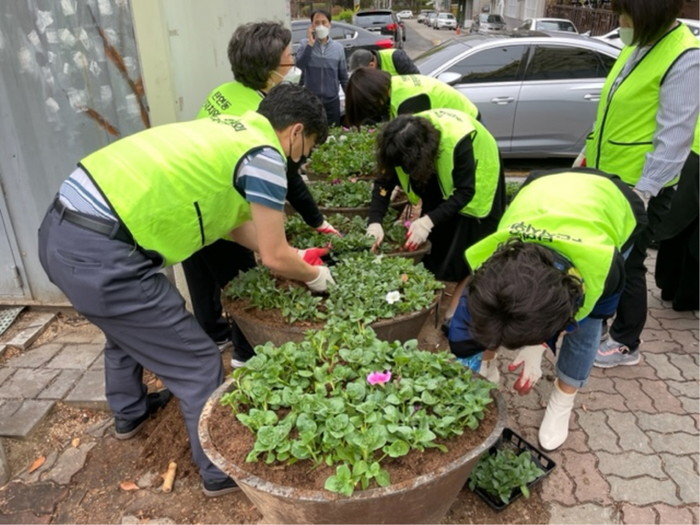 조경순 주민자치회장은 이번 초화식재를 통해 동 행정복지센터 외벽 석면제거 공사로 자칫 어수선해질 수 있는 마을 미관을 봄꽃으로 정비함과 동시에 거리에 새봄의 활력을 불어넣을 예정이라고 밝혔다.