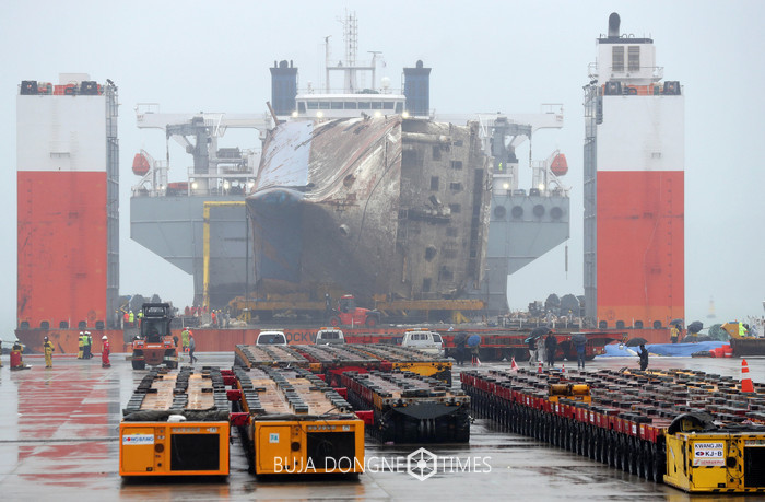 세월호 선체를 육상에 거치하는 작업이 초읽기에 들어간 5일 오전 전남 목포신항만에서 세월호가 모듈 트랜스포터를 이용한 육상거치를 위해 방향을 바꿔 재접안하고 있다. 2017.04.05.