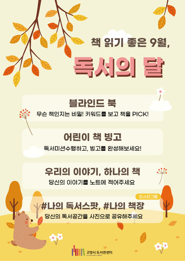독서의 달 행사는 화정도서관 등 16개 시립도서관에서 9월 1일부터 참여 가능하다. 자세한 사항은 도서관 홈페이지 또는 전화(☎031-8075-9027)로 문의하면 된다.