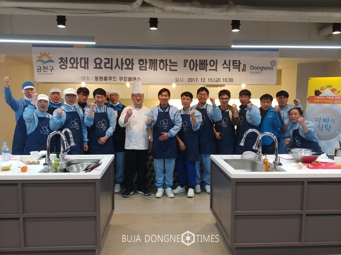 [부자동네타임즈 이병도 기자]금천구(구청장 차성수)가 최근 동원홈푸드 쿠킹클래스(가산동 소재)에서 올바른 음식문화 조성을 위해 직장인 아빠 20명과 함께 ‘청와대 조리사와 함께하는 아빠의 식탁’ 행사를 진행했다.