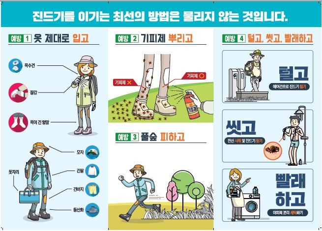 특히 농작업 및 야산‧들판에서 야외활동 시 피부 노출을 최소화하고 노출된 피부에 진드기 기피제를 뿌리는 것이 좋다. 야외활동 후에는 입었던 옷을 반드시 세탁하고 물린 곳이 없는지 살핀 뒤 샤워를 하고, 진드기에 물리면 진드기를 손으로 터트리거나 떼지 말고 즉시 인근 병원에 방문해 제거 및 치료를 받아야 한다.