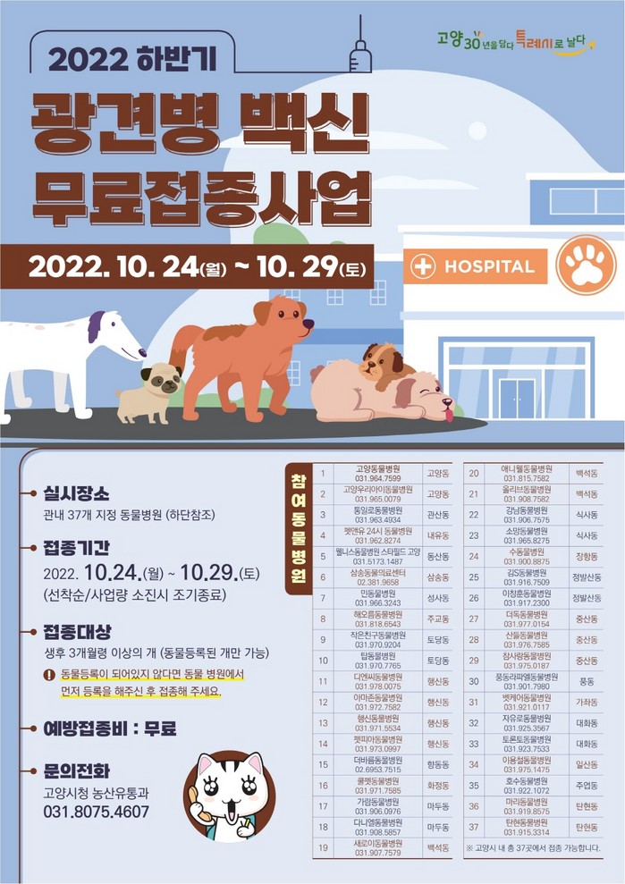 [부자동네타임즈 김인수기자] 고양특례시(시장 이동환)가 오는 10월 24일(월)부터 29일(토)까지 광견병 백신 무료 예방접종을 지역 내 지정된 동물병원 37개소에서 실시한다.