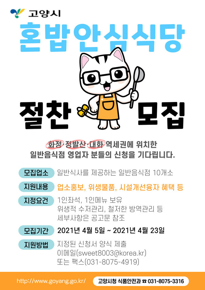 신청대상은 화정, 정발산, 대화 역세권에 위치하고, 일반 식사를 제공하는 일반음식점이다. 혼밥안심식당의 지정요건은, 1인 좌석 보유, 1인 메뉴 보유, 위생적 수저관리, 철저한 방역관리 등이다. 선착순으로 신청한 업소에 대해 현장 확인을 통해 10개소를 지정할 계획이다.