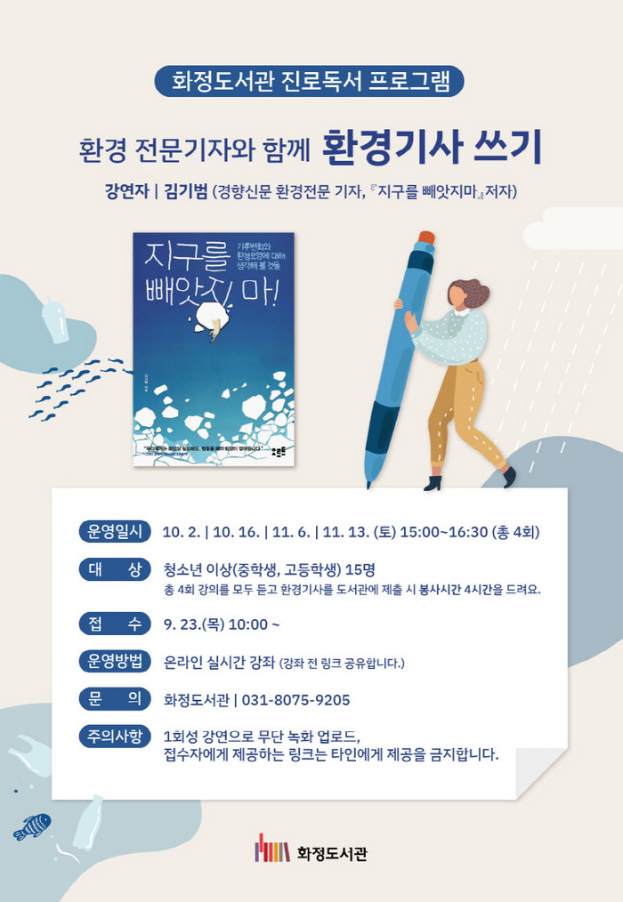 [부자동네타임즈 김인수기자] 고양시 화정도서관이 청소년 대상 진로독서 프로그램 ‘환경 전문기자와 환경기사 쓰기’를 오는 10월 2일부터 11월 13일까지 총 4회 진행한다.