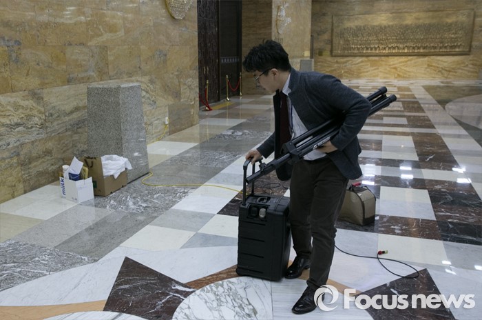 (서울=포커스뉴스) 6일 오후 서울 여의도 국회 로텐더홀에서 새정치민주연합 당직자들이 농성장을 정리하고 있다. 정부의 역사교과서 국정화 강행에 반발해 의사일정 등을 보이콧하며 농성에 돌입했던 새정치민주연합은 농성을 해제하고 오는 9일부터 진행되는 국회 일정에 정상적으로 참여하기로 결정했다.