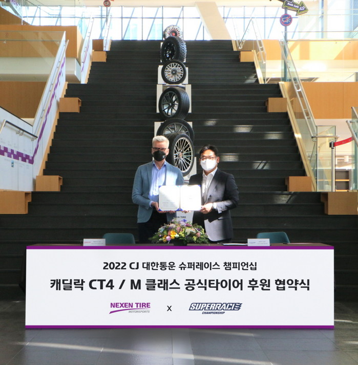 [부자동네타임즈 김인수기자] 2022 CJ대한통운 슈퍼레이스 챔피언십이 넥센타이어와 후원 계약을 맺었다. (주)슈퍼레이스 김동빈 대표와 넥센타이어 중앙 연구소 마이클 하우프트(Michael Haupt) 개발본부장은 11일(월) 서울시 강서구 더넥센유니버시티에서 후원 협약식을 진행했다. 이번 협약에 따라 넥센타이어는 슈퍼레이스 챔피언십 M 클래스와 캐딜락 CT4 클래스에 N’FERA(엔페라) SUR4G를 독점 공급함으로써 공식 타이어 후원을 지속한다.