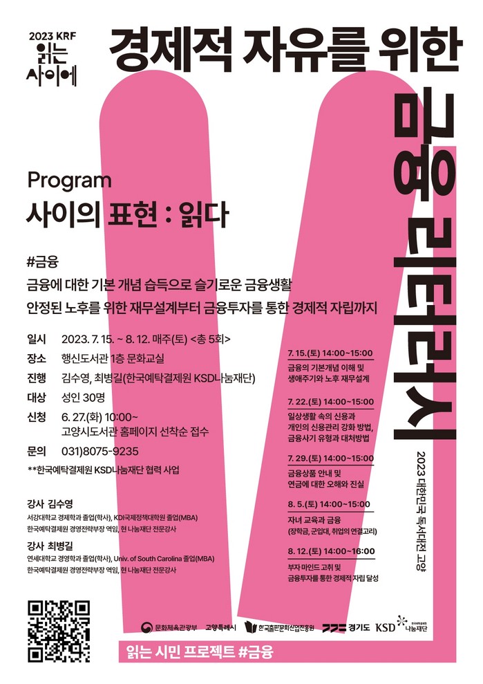 [부자동네타임즈 김인수기자] 2023 대한민국 독서대전을 기념해 ‘읽는 시민 프로젝트’라는 이름으로 다양한 시민 강좌를 운영하고 있다. 오는 7월 15일부터 다음달 12일까지 행신도서관은 ‘경제적 자유를 위한 금융리터러시’를 운영한다.