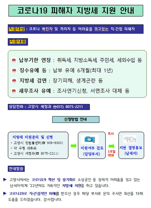 [부자동네타임즈 김인수기자] 고양시가 코로나19 장기화로 어려움을 겪는 납세자를 지원하기 위해 납부기한 연장, 징수유예, 감면, 세무조사 유예 등 지방세 지원을 실시한다.